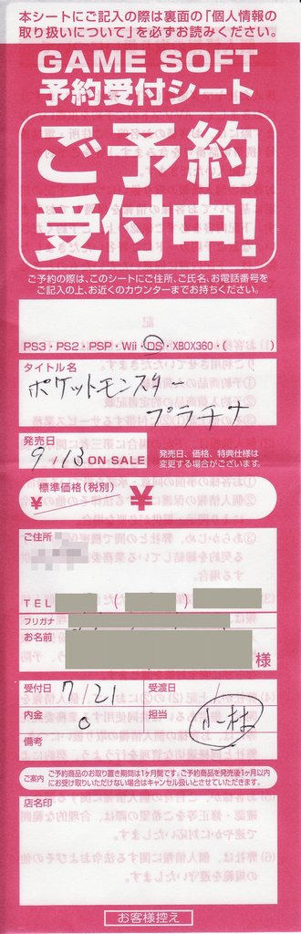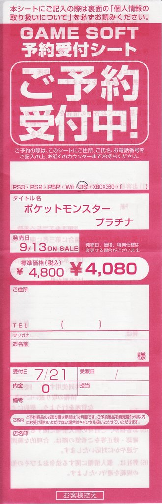 ポケットモンスタープラチナを、いつものようにヤマダ電機で予約してきました。