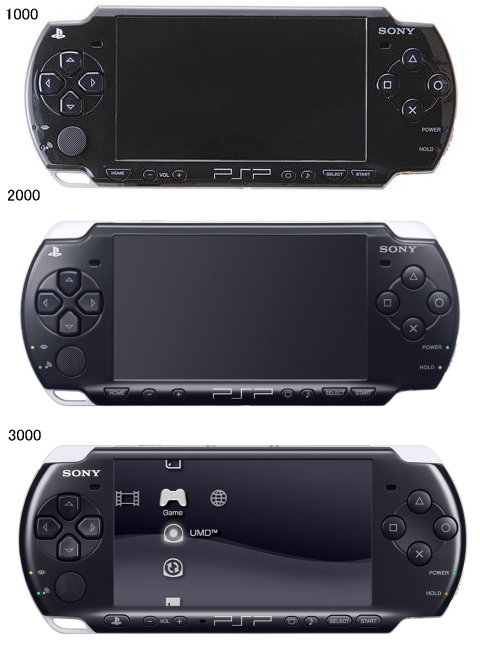 ↓PSP-1000、PSP-2000、PSP-3000、それぞれのシリーズを比較。