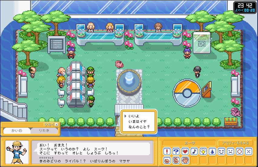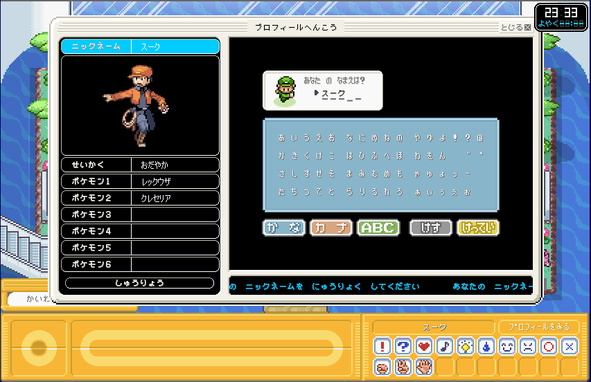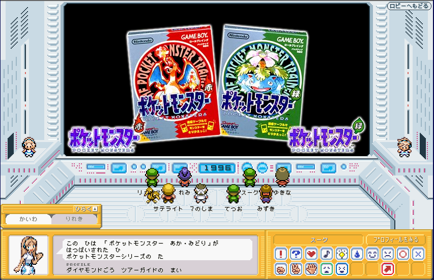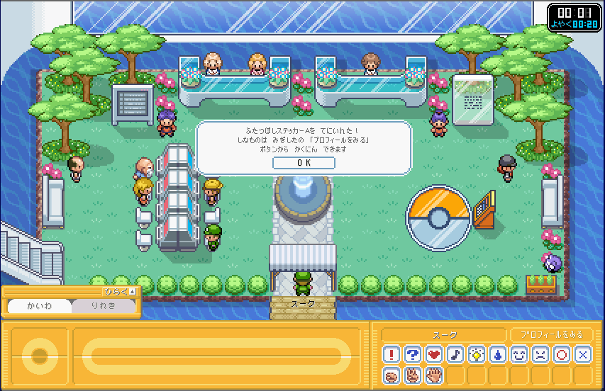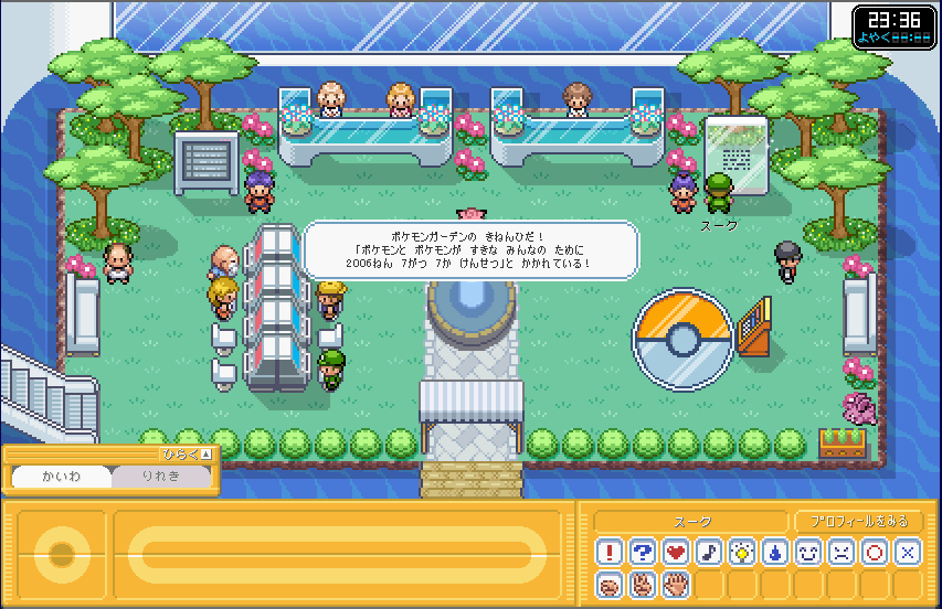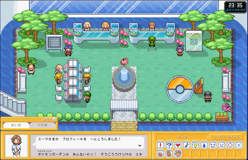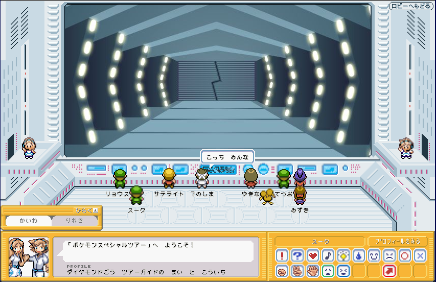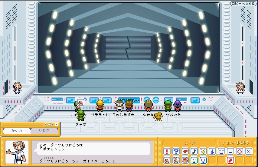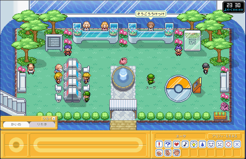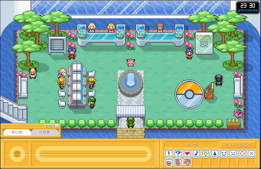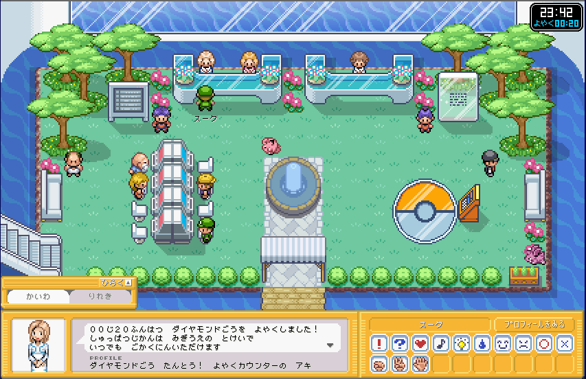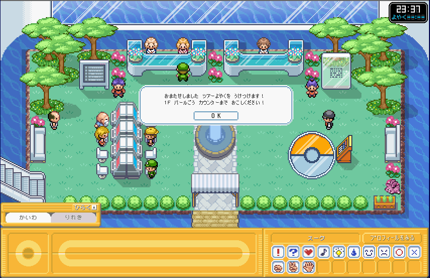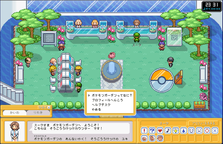 | ここが、ポケモンガーデンのロビーです。 まずは、右側のカウンター 「そうごううけつけカウンター」 に行きましょう。 ここで、プロフィールを設定しましょう。 (もしかすると、初回時はここに行かなくてもプロフィール設定画面が出てくるかも) |