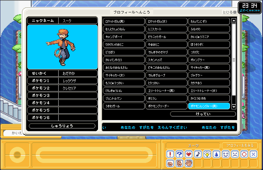 | 次に、左側にある トレーナーのところをクリックして トレーナーの種類を設定します。 特にどれでも変わりはないので、 自分の好きなのにすればいいと思います。 ちなみに、自分は 「ポケモンレンジャー(男)」を選びました。 |