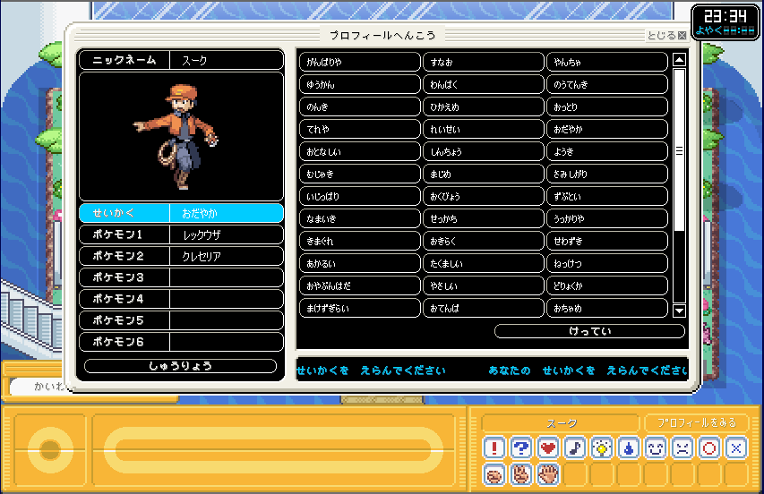| 次に、左側にある "せいかく"のところをクリックして 自分のせいかくを決めます。 どれでも好きなのを選んでいいと思います。 そんな自分は、「おだやか」な性格にしました。 |