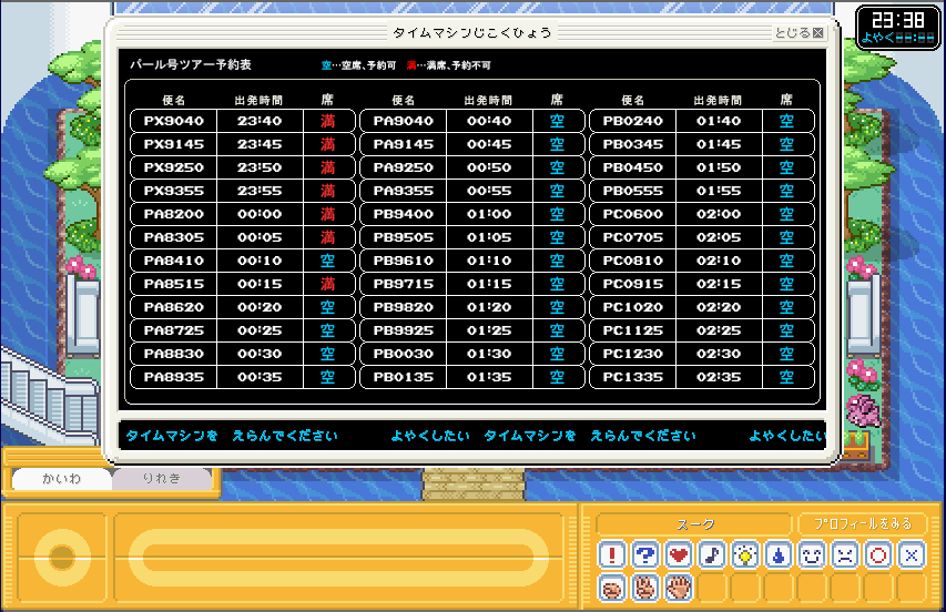 | とりあえず、00:20発のダイヤモンド号を予約しました。 00:20までは、ガーデン内で遊んでいてOKの用です。 一回ブラウザを落としても大丈夫です。 |