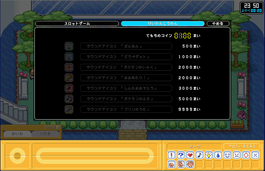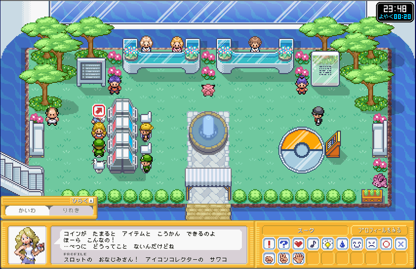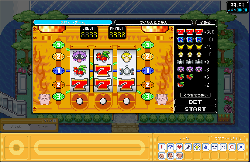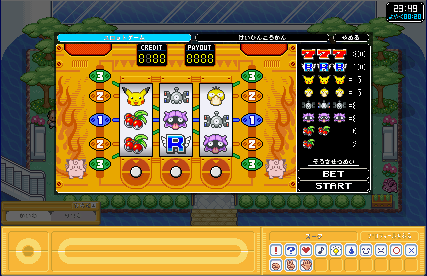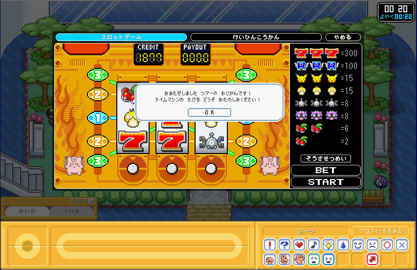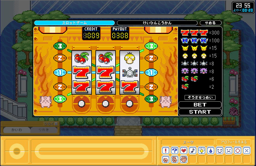 | ポケモンガーデンでスロットをやりたかったので、 とりあえず、おじさんからコインを100枚もらった。そしてプレイ! |