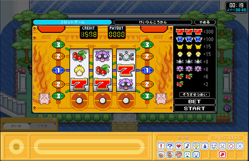 | スロットはこのような画面です。 ルビー・サファイアのスロットって感じ。 操作は、やってる内に分かるはず。 |